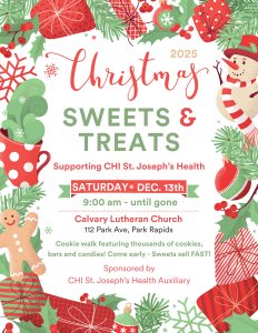 Join us for our annual Christmas Sweets & Treats sale on Saturday, December 13th, starting at 9:00 AM at Calvary Lutheran Church (112 Park Ave, Park Rapids). This cookie walk, supporting CHI St. Joseph’s Health and sponsored by the CHI St. Joseph’s Health Auxiliary, features thousands of delicious cookies, bars, and candies! Be sure to come early, as these sweet treats sell fast!
