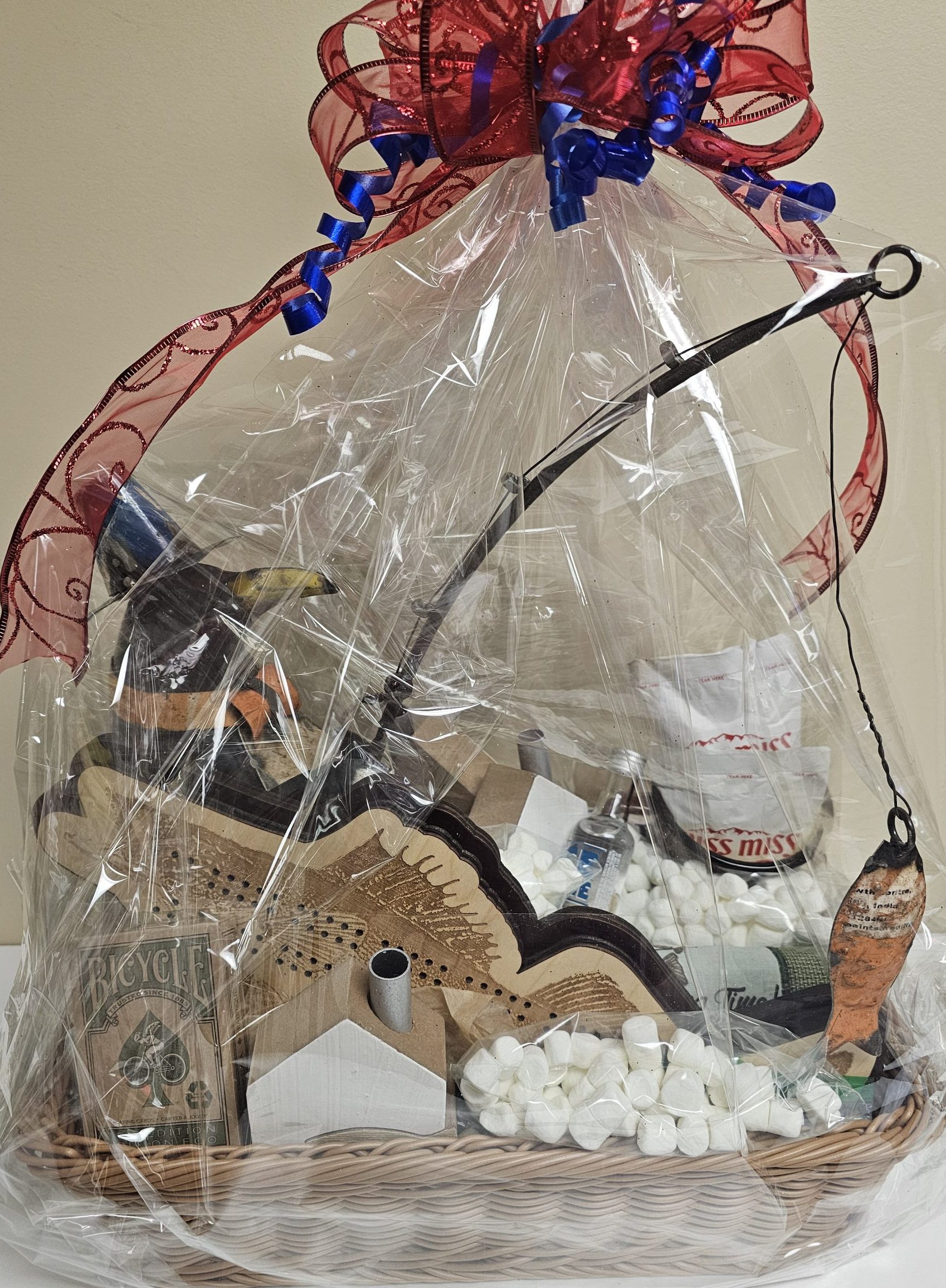 Basket includes: Metal Fishing Penguin, Fish Cribbage Board, 2 Mugs, 2 Tea Towels, Tea Towel, Set of Fish Houses, Deck of Cards and Marshmallows.