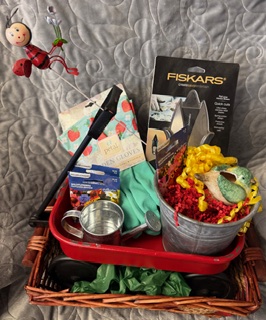 Basket includes: Wagon, Fiskars Quick Cuts, Garden Gloves, Watering Can, Watering Bird, Dragon Fly, Bucket, 3 Wildflower Seeds and Ladybug.